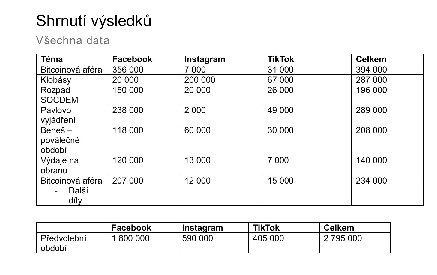V následující tabulce uvedu některá témata a počty návštěvníků na sociálních sítích z poslední doby.