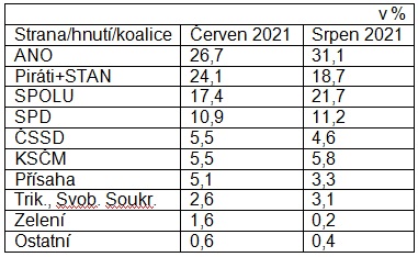 Tabulka srovnání volebních preferencí za červen a srpen agentury STEM