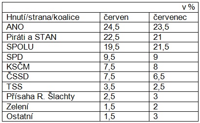 Ten trend je, že pravice včetně Pirátů, pokud jde o volební preference, stagnuje a hnutí ANO vede. V souhrnu mají pravostředové strany 42,5% preferencí a ty ostatní, tzn. hnutí ANO, SPD, KSČM a ČSSD mají v souhrnu 46,5% preferencí.