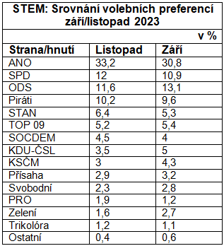 Hnutí ANO směřuje ke svému pravděpodobnému maximu, tj. k hranici 35%, v listopadu dosáhlo na úroveň 33,2% preferencí (v září to bylo 30,8%). Oproti předchozímu měření je to tedy poměrně podstatný nárůst.