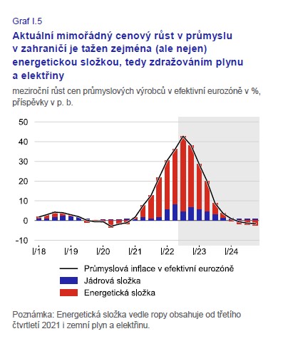 Zpráva ČNB o inflaci (o měnové politice) má na straně 10 mimořádně zajímavý údaj o složkách růstu cen v průmyslu (Graf I.5). Jde o to, kam ceny vyhnala energie a co dělají ceny po odečtení tohoto vlivu. Jak je vidět, průmyslové ceny vyskočily meziročně o třetinu, ale jádrová složka bez energií tvořila jen nějakých pět procent. Podle jiného grafu ve stejné zprávě byla v Německu jádrová inflace někde u dvou procent.