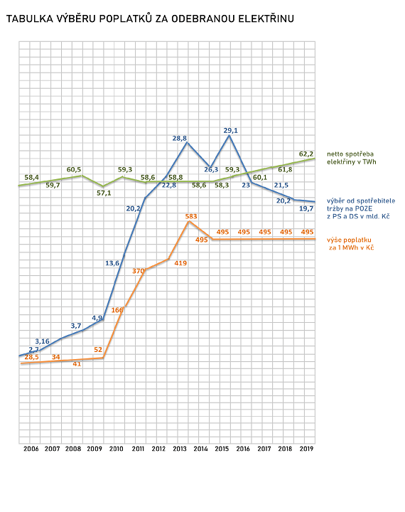 Jak je zřejmo z grafu, od roku 2015 v ČR stále stoupá netto spotřeba elektřiny z 59,3 TWh až na dnešních 62,2 TWh, oproti tomu celkový vykazovaný výběr poplatků za odebranou elektřinu od roku 2015, v rozporu s tím, stále neúprosně klesá, a to z 29,1 miliardy Kč v roce 2015 až na dnešních 19,7 miliardy Kč.