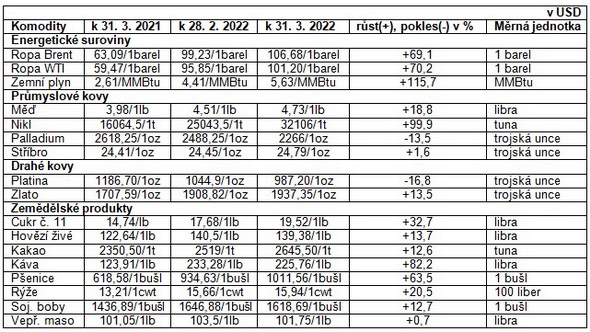 Vývoj cen komodit k 31.3.2021, k 28.2.2022 a k 31.3.2022