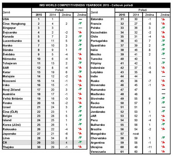 „Ke zlepšení pozice České republiky přispěl ekonomický růst, pozitivní vývoj vládních financí a zlepšení motivace a organizace v podnikové sféře. Tyto faktory dohromady vedly ke zlepšení relativní pozice ČR v oblasti ekonomické výkonnosti (26. pozice), efektivity vlády (31.) a efektivity podnikatelského sektoru (31.),“ čteme v tiskové zprávě, kterou rozesílal Vilém Semerák ze think-tanku IDEA při CERGE-EI, který je spolupracujícím odborným partnerem IMD za Českou republiku.