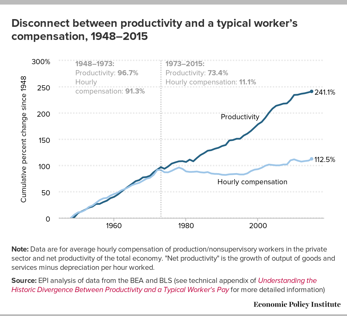 V předchozím období, v čase ekonomiky s rysy sociálního státu, který je liberálními reformátory vnímán jako „netržní“, stoupaly mzdy úměrně růstu produktivity, tedy relativně spravedlivě. Není divu, že levicoví politici (Bernie Sanders) a ekonomové (Dean Bakerv práci Rigged: How Globalisation and the Rules of the Modern Economy Were Structured to Make the Rich Richer, Center for Economic and Policy Research, Washington D. C. 2016) označují současné politické a ekonomické uspořádání za podvod.