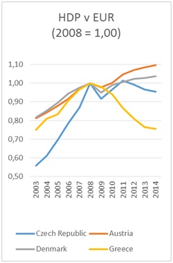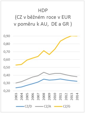 Dobře je to patrné z obrázku sporovnáním HDP Česka, Rakouska a Dánska v EUR od roku 2003. Zpočátku se tento rozdíl prudce snižoval (křivka stoupala), nyní se mírně zvětšuje (křivka klesá). Roku 2008 jsme měli HDP ve směnném kurzu na úrovni 35 procent Dánska a 44 procent Rakouska. Dnes už je to jen 32 procent Dánska a 38 procent Rakouska. Propad Řecka na 90 procent úrovně České republiky se roku 2013 zastavil.