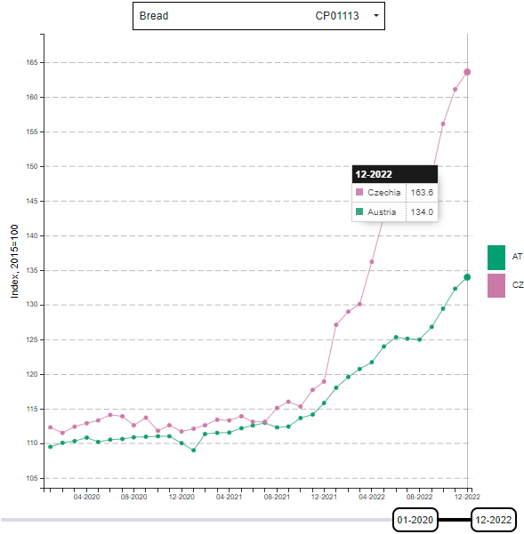 Podívejme se třeba na cenu chleba u nás a v Rakousku. Česká linie (fialová) se začíná vzdalovat od rakouské (zelená) až po lednu minulého roku, což se shodou okolností datum nástupu Fialovy pětikoalice. V lednu 2021 byly ceny u nás i u nich zhruba stejně 15 procent nad hladinou průměru roku 2015. Teď už je český chléb dražší o 63 procent, zatímco ten rakouský jen o 34 procent.