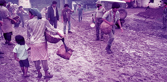 Vedeme hosty na pole, aby si prohlédli úrodu. Milice a vojáci jsou na okraji záběru. Prezidenta Daniela Ortegu doprovází viceprezident Sergio Ramírez, vynikající spisovatel. Roku 2017 získal za celoživotní dílo španělskou prestižní Cervantesovu cenu.