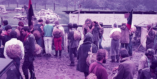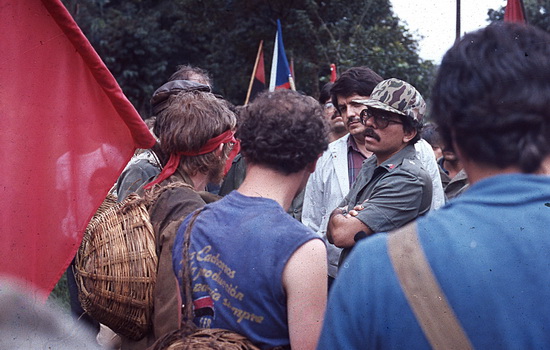 Český hlouček je pod naší vlajkou. Sandinovská černo-rudá se tyčí nad Němci. Vlevo v popředí jsou Řekové a zády k nám v zelené bundě německý profesor Dietrich Heinz, který učil sociologii na univerzitě v Mexiku. Byl jsem jeho spolupracovníkem při ranním dláždění chodníčku z nalezených kamenů v bahně před ubikacemi.