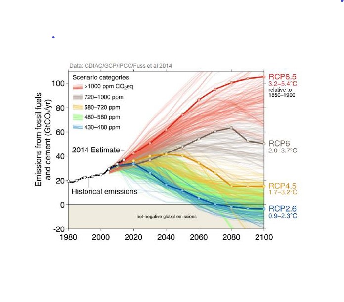 Co horší, nejhorší. Jak píše: „Vývoj emisí skleníkových plynů k roku 2014 zatím odpovídal nejhoršímu scénáři.“ Potvrzuje to graf, na kterém jsou vyneseny „reprezentativní směry dosažení koncentrací“ (RCP) skleníkových plynů. Sledujme červenou linii RCP 8,5, která předpokládá růst globálních teplot na konci století o 3,2 až 5,4 stupně Celsia. Právě na ní leží odhad roku 2014 (Estimate).