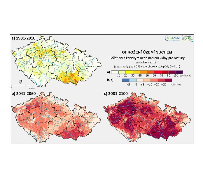 Obrázek s prognózou akademického ústavu CzechGlobe podle středního scénáře ukazuje, jak bude přibývat dní s kritickým nedostatkem vláhy pro rostliny v období největší vegetační intenzity, tedy od dubna do září. Za padesát let (až se nemluvňata stanou dědečky) to bude všude dost hrozné.