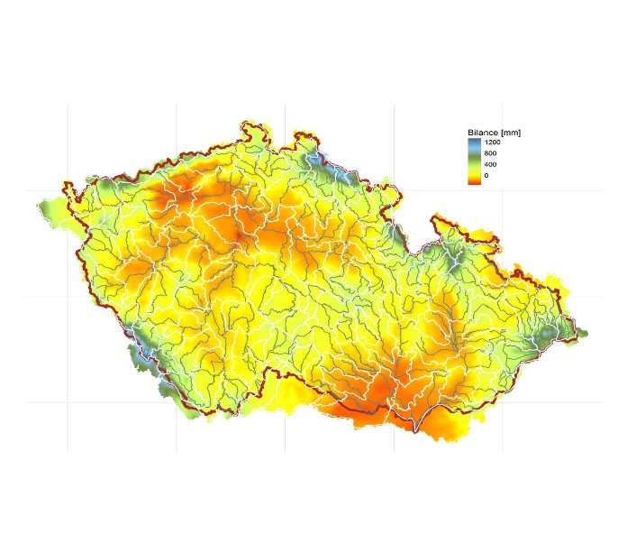 Mapa vodní bilance (rozdíl ročního úhrnu srážek a potenciální evapotranspirace), zdroj: VÚV