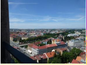 Hledíme z Bílé věže směrem ke třídě Karla IV. Zajímá nás teplota stromořadí ve městské zástavbě.