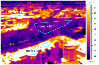 Střechy domů dosahují teploty 63 oC, povrch stromů 35 oC.