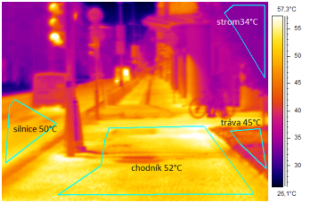 Teplota povrchu silnice 50 oC, teplota chodníku 52 oC, strom na okraji má 34 oC