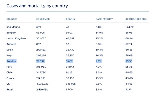 Uvedené skutečnosti jsou odpovědí na tornádo kritiky, které v uplynulých měsících postihlo Švédy, že nepodlehli pandemii paniky, neuzavřeli ekonomiku a neumrtvili společenské dění. Okoštujte několik titulků. CBS News: Švédsko předvádí jak nebojovat proti Covid-19 New York Times: Švédsko je varovným příkladem pro celý svět Newswek: Úmrtí na Covid-19 ve Švédsku jsou důsledkem otevřené ekonomiky a společnosti.