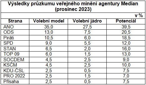 K tomu ještě přistupují jiné údaje, které jsou součástí analýzy Medianu, a to pevnost volebního jádra jednotlivých stran. Volební jádro nad 5% voličů mají pouze čtyři politické strany či hnutí: ANO (27,5% - !), ODS o dva parníky dále za hnutím ANO (jen 7,5%), Piráti (6%) a SPD s 5,5%.