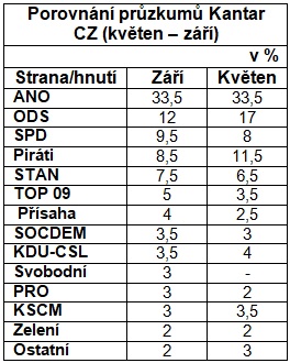 Velmi podstatným způsobem poklesly oproti květnu t. r. volební preference ODS - ze 17 na 12%. ODS sice zůstala druhou nejsilnější stranou, ale rozdíl proti vedoucí straně pelotonu, hnutí ANO, je propastný. Hnutí ANO si udrželo i v září stejnou podporu veřejnosti jakou mělo v květnu, a to 33,5% preferencí.