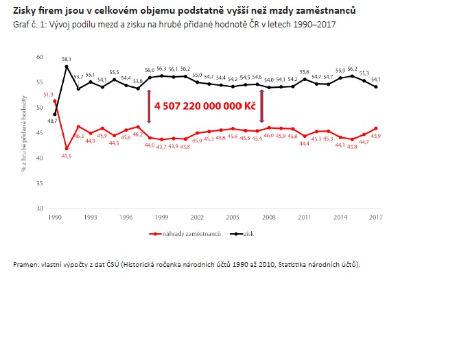 Na Slovensku vládnou podobné poměry, to je doklad, že takhle to bylo nastaveno v samotném začátku transformace. V roce 1990, kdy jsme ještě byli Československem, byl podíl zisků a náhrad zaměstnanců zhruba stejný, ale rok na to se podíl zaměstnanců snížil na 41,9 procenta a podíl zisků prudce zvýšil na 58,1 procenta, a tak to zůstalo zachováno po mírných korekcích dodnes. „Čeští zaměstnanci svými nízkými mzdami fakticky subvencují velmi vysokou ziskovost firem působících na českém území,“ konstatuje zpráva a vypočítává celkový objem této subvence jen za období 1991 až 2017 na neuvěřitelných 4,5 bilionu korun. To je jeden roční HDP.