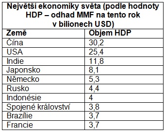 Pokud se podíváme na porovnání velikosti největších ekonomik světa podle hodnoty HDP dle parity kupní síly, v odhadu MMF na tento rok v bilionech USD, získáváme už jiné pořadí.