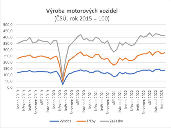 Statistiky zahraničního obchodu a průmyslu nejvíc ovlivnila automobilová výroba, která se trochu vzpamatovala. Jak zaznamenalo už v půli března Sdružení automobilového průmyslu, v České republice bylo od začátku roku vyrobeno 215 101 osobních vozidel, tedy o čtvrtinu více než v minulém roce. Nadále se však do objemu produkce promítají rozkolísané dodavatelské řetězce a nedostatek některých komponent, které téměř na celý únor zastavily výrobu v kolínské Toyotě. Pokles výroby způsobený zejména nedostatkem polovodičů zaznamenali i výrobci autobusů a motocyklů. Vozidel s elektrickým pohonem bylo vyrobeno 22 280, jejich podíl na celkové produkci se tak dlouhodobě drží na úrovni deseti procent.