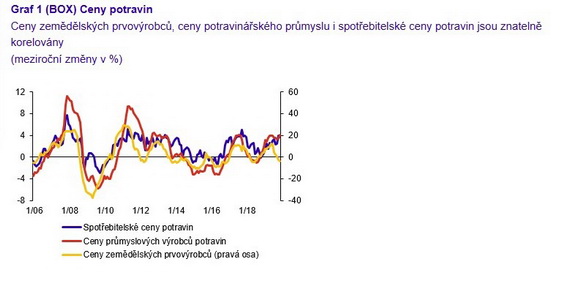 Otázka, kdo může za růst cen, tedy zůstává. Před čtyřmi lety se to pokoušela zachytit Česká národní banka a dospěla k názoru, že každý si bere zhruba stejně čili, když cena roste, dostanou víc prvovýrobci, zpracovatelé i distribuce. Vidíme to na grafu ze zprávy o inflaci ze začátku roku 2020, kdy do toho možná bylo lépe vidět – nebo kdy zdroje úspěšně lhaly.