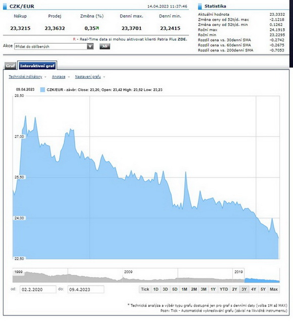 Kurz koruny v posledních dnech soustavně posiloval – na grafech to má trochu matoucí sklon křivky dolů, ale to znamená, že za euro dostáváme méně a méně. Z pátečního rána je zaznamenána hodnota 23,21 CZK/EUR. Během dne pak přišla mírná korekce, ale pořád je důvod k oslavám. Korunu zvedá úrokový rozdíl vůči eurozóně, ale ten samý jev zase dusí ekonomiku. Z řad bankovní rady se ozývají hlasy osamělých „jestřábů“, které by rády zvyšovaly základní úrokovou sazbu nad stávajících 7 %, ale mají nejspíš hodnotu pouhé slovní intervence, jakéhosi varování, že to ČNB s tou pevnou korunou myslí vážně. Absolutní kurzový rekord z roku 2008, který činí 22,88 kaček za euro, je tak možná na dosah.