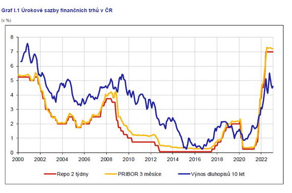 Koruně zatím pomáhá kladný úrokový diferenciál, čili skutečnost, že naše úrokové sazby jsou výše než jinde. Výnos dvouletého dluhopisu je v Česku 5,51 %, zatímco v eurozóně je tento dluhopis s výnosem jen 3,01 %. Rozdíl je skoro dvojnásobek, 2,5 %. Kdybychom však brali jen signály finančního trhu, české základní úrokové sazby půjdou spíše dolů. Český výnosová křivka má inverzní sklon, to znamená, že krátkodobé sazby jsou vyšší než dlouhodobé. Tím nám hlásí, že současné vysoké sazby dlouho nevydrží. Tříměsíční sazba PRIBOR 3M je na 7,20 %, ale výnos desetiletého dluhopisu je někde na 4,50 %. Vývoj delších sazeb je teď dost neklidný, ale je možné, že už jsou za vrcholem.
