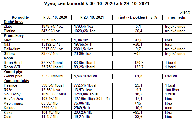 Razantně se navyšují ceny průmyslových kovů (snad s jedinou výjimkou palladia a stříbra, které se udržují pod cenovou úrovní minulého roku nebo těsně nad ní). Rostou ceny prakticky všech surovin, nezbytných pro potravinářskou výrobu. Nejvíce v této skupině komodit pro potravinářský průmysl meziročně vzrůstá cena pšenice (+29,1%). Ceny vepřového a hovězího masa meziročně vzrůstají o 17%, respektive 16%. Zhruba na této úrovni se meziročně také udržuje cena sojových bobů, které se používají jako krmivo pro hospodářská zvířata (18,2%).