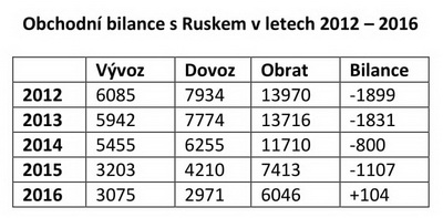 Pokud jde o český export, tak jak je vidět z přiložené tabulky, je v roce 2016 zhruba o třetinu nižší než v roce 2012 nebo 2013. Samozřejmě, že to poznamenalo především řadu českých strojírenských firem, ale také potravinářský průmysl. Některé české firmy kvůli tomu dokonce zkrachovaly (např. Transporta Chrudim).
