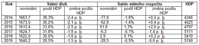 Po sněmovních volbách v roce 2018 nastoupila Babišova vláda, v níž bylo seniorním partnerem hnutí ANO a menší koaliční stranou ČSSD. Dá se tedy říci, že v letech 2014 – 2019 jsme zažívali nevídaný příznivý vývoj státního dluhu, jeho mírný pokles v absolutním vyjádření a významný relativní pokles ve vztahu k rychle rostoucímu HDP. HDP tak nevzrůstal, díky nárůstu státního dluhu, ale v důsledku růstu výkonnosti české ekonomiky. Mimochodem, v roce 2013 činil HDP českého státu 4163 mld. Kč a v roce 2019 již dosáhl robustní sumy 5749 mld. Kč. Tedy v tomto šestiletí vzrostl HDP Česka o 1606 mld. Kč (!) a státní dluh přitom nerostl. To je výborná vizitka finanční politiky obou koaličních stran.