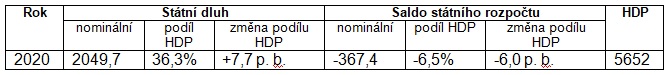 Vývoj státního dluhu a schodek (-) státního rozpočtu v roce 2020