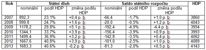 Vývoj státního dluhu a schodky (-) státního rozpočtu v letech 2007 – 2013 a vývoj HDP