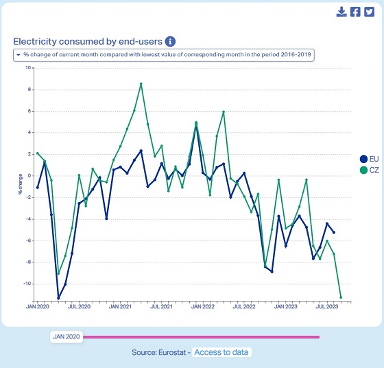 ad "...celková slabost ekonomiky, ale přidávají se i další důležité vlivy. Prvním jsou úspory, ke kterým nás dohnaly vysoké ceny, a druhým je rostoucí vliv prosumers, tedy těch, kdo jsou spotřebiteli i výrobci zároveň. Část spotřebované elektřiny tak neprochází trhem a není touto statistikou zachycena...."