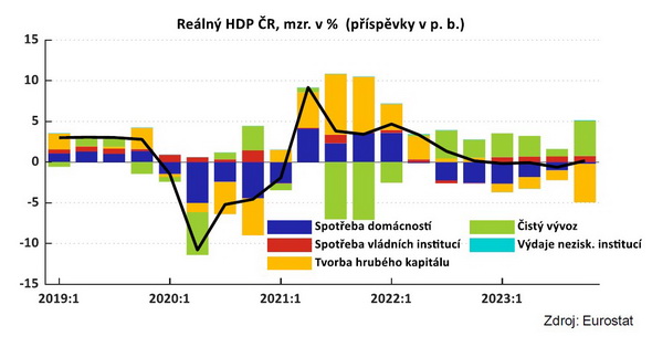 Výmluvný je také obrázek s reálným vývojem HDP (po odečtu inflace), který zachycuje i to, jak se na tom podílely jednotlivé segmenty národního hospodářství.