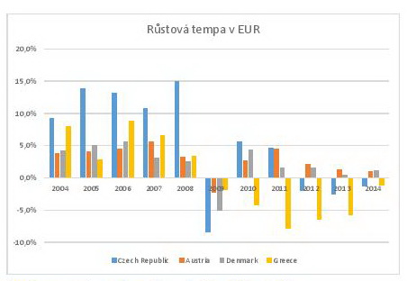 Chyťme se tedy aspoň toho měnového téma. Zkusím si to trochu zjednodušit a řeknu, že výsledek kombinace hospodářské a měnové politiky můžeme pozorovat v podobě hospodářského růstu ve směnném kurzu. Vezmeme HDP v korunách a spočítáme, kolik by to hodilo euro. Výsledek pravicové vlády ČR byl horší (pokles modrého sloupku o 8,4 procenta roku 2009) než dosud nejhorší rok v Řecku (pokles žlutého sloupku o 7,9 procenta roku 2011).