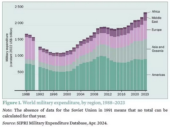 Zopakujeme fakty o vývoji celosvetových výdavkov na zbrojenie, o ktorých sme už viackrát písali. Sú viditeľné aj na obrázku Figure 1. World military expenditure, by region, 1988 – 2023 v informácii. Chýbajú tam len výdavky za rok 1991 kvôli absencii údajov zo ZSSR. Konkrétne sumy nebudeme porovnávať, lebo ich výška sa mení podľa toho, z akého roka sa berú stále ceny v USD. V tohtoročnej správe sa výška výdavkov počítala podľa stálych cien v USD z roku 2022. Predsa však doplníme, že podľa nich sa magická hranica 2 000 miliárd dolárov prekročila v roku 2019.