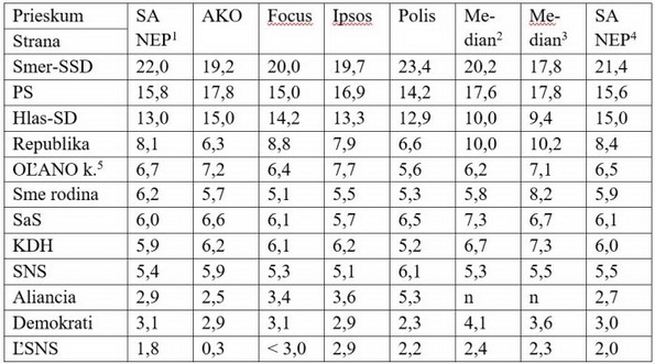 Z uvedených prieskumov sú pre veľké odchýlky pochybné výsledky prieskumu Median SK pre RTVS 25. – 31. augusta.