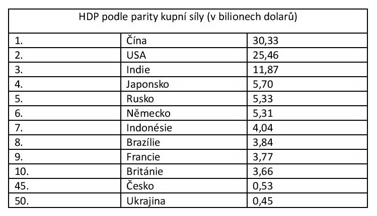 Bohužel, politické elity Spojených států a Západu obecně (včetně současné české vlády) podcenily realitu, která se v ekonomice světa v posledních 10 – 20 letech vytvořila. Světová banka nedávno vydala tabulku – přehled, ve které seřadila státy podle HDP dle parity kupní síly.