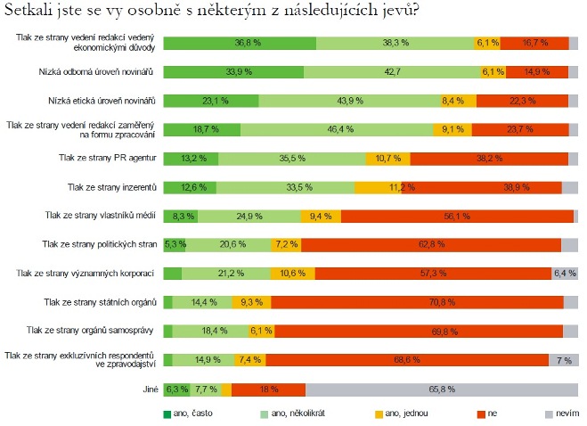 Co je ale závažnější, to je právě tlak vlastníků novin, vedení redakcí, inzerentů a PR agentur. Z průzkumu totiž vyšlo najevo, že 43% novinářů v průzkumu potvrdila, že se s nátlakem vlastníků novin setkali minimálně jednou, většina z tohoto počtu však opakovaně. Vedení redakcí pak na žurnalisty nejčastěji tlačí z ekonomických důvodů. S tímto jevem se setkalo 81% z nich. Dalším, neméně zajímavým údajem, je to, že vedení redakcí tlačí i na formu zpracování mediálních výstupů, s čímž se setkalo 75% českých žurnalistů. S nátlakem ze strany PR agentur se pak setkalo 60% novinářů. Ve světle těchto výsledků je tedy patrné, že pojem „nezávislá média“ je asi stejně vypovídající, jako „slaný cukr“.