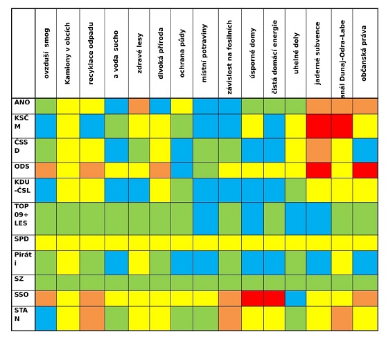Strana zelených a s malými nedostatky také TOP09 mají jednoznačně nejkomplexnější a nejkonkrétnější programy pro ekologickou reformu ekonomiky, zdravější životní prostředí a lepší ochranu divoké přírody. Naopak cíle ODS a Strany svobodných občanů (SSO) nejvíce zhoršují prostředí pro život lidí a oslabují ochranu přírody v ČR. SPD Tomia Okamury nemá žádný ekologický program a nevíme tedy, jaké chce životní prostředí a zda jí záleží na ochraně české přírody.